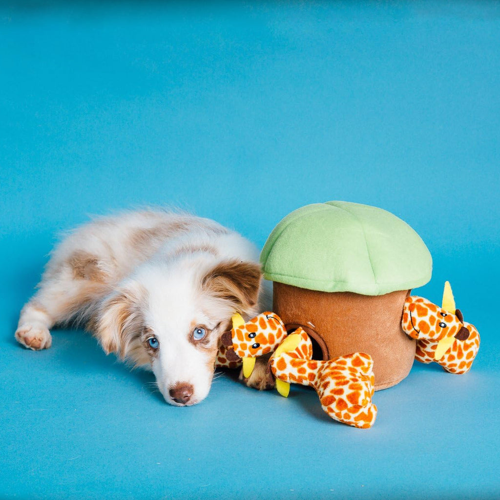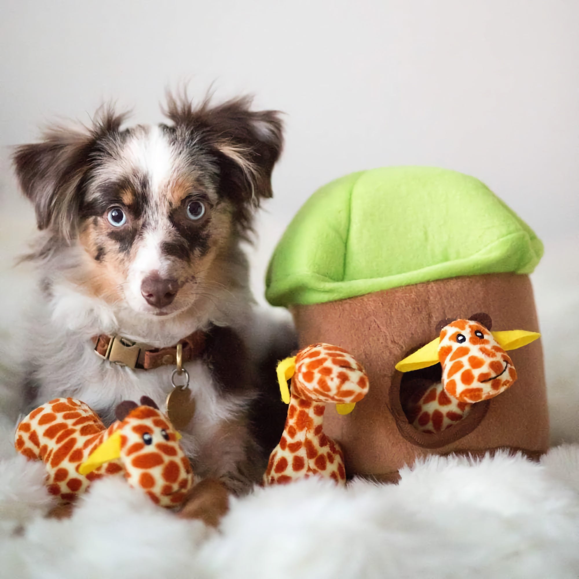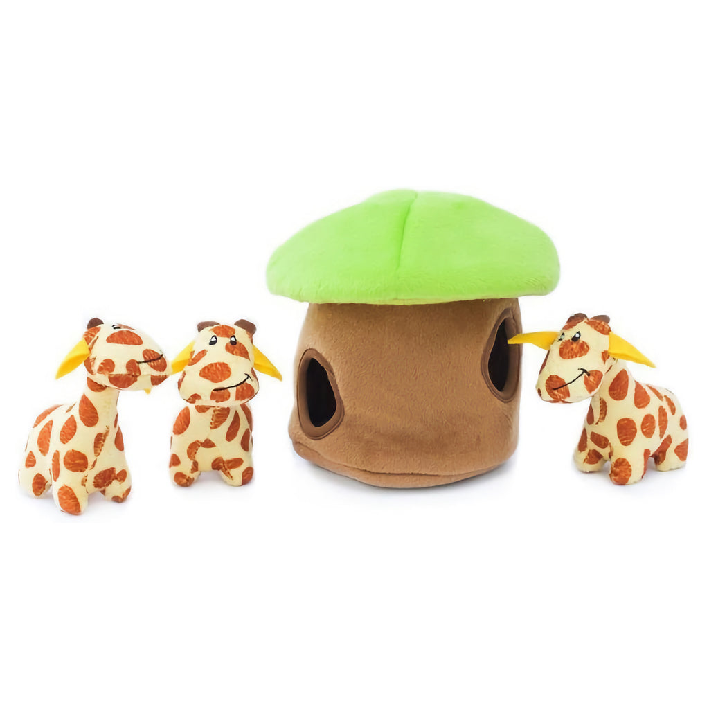 Giraffe Lodge: The gentle giraffes are resting inside their cozy Zippy Burrow lodge. Challenge your pup to nuzzle in and coax them out from their hiding spot. Comes with 1 lodge and 3 small squeaky giraffes (1 round squeaker in each giraffe). 21 x 15cm
