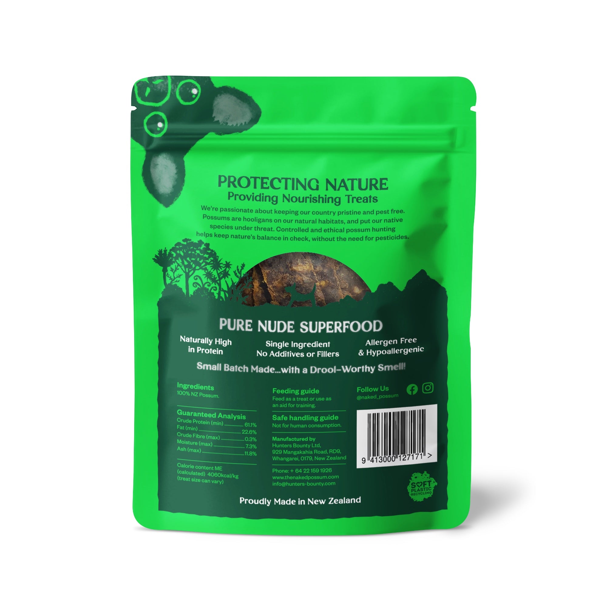 Give your dog a taste of the wild with The Naked Possum Bare Possum Treats - pure, air-dried possum meat that’s naturally high in protein and rich in Omega 3 & 6. With meat this good, there’s no need for additives, fillers, or preservatives. Just real, wild-caught possum, air-dried to lock in all the drool-worthy flavour and essential nutrients.