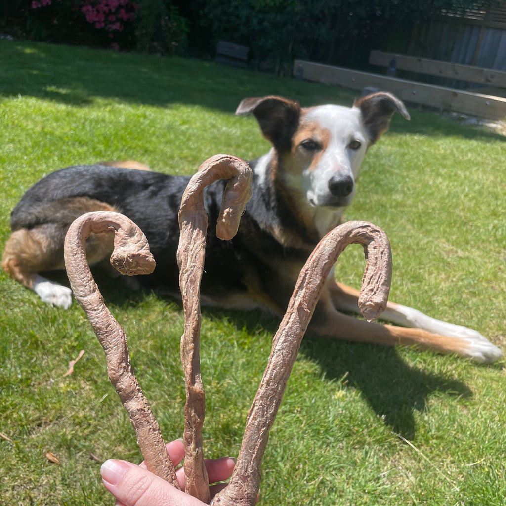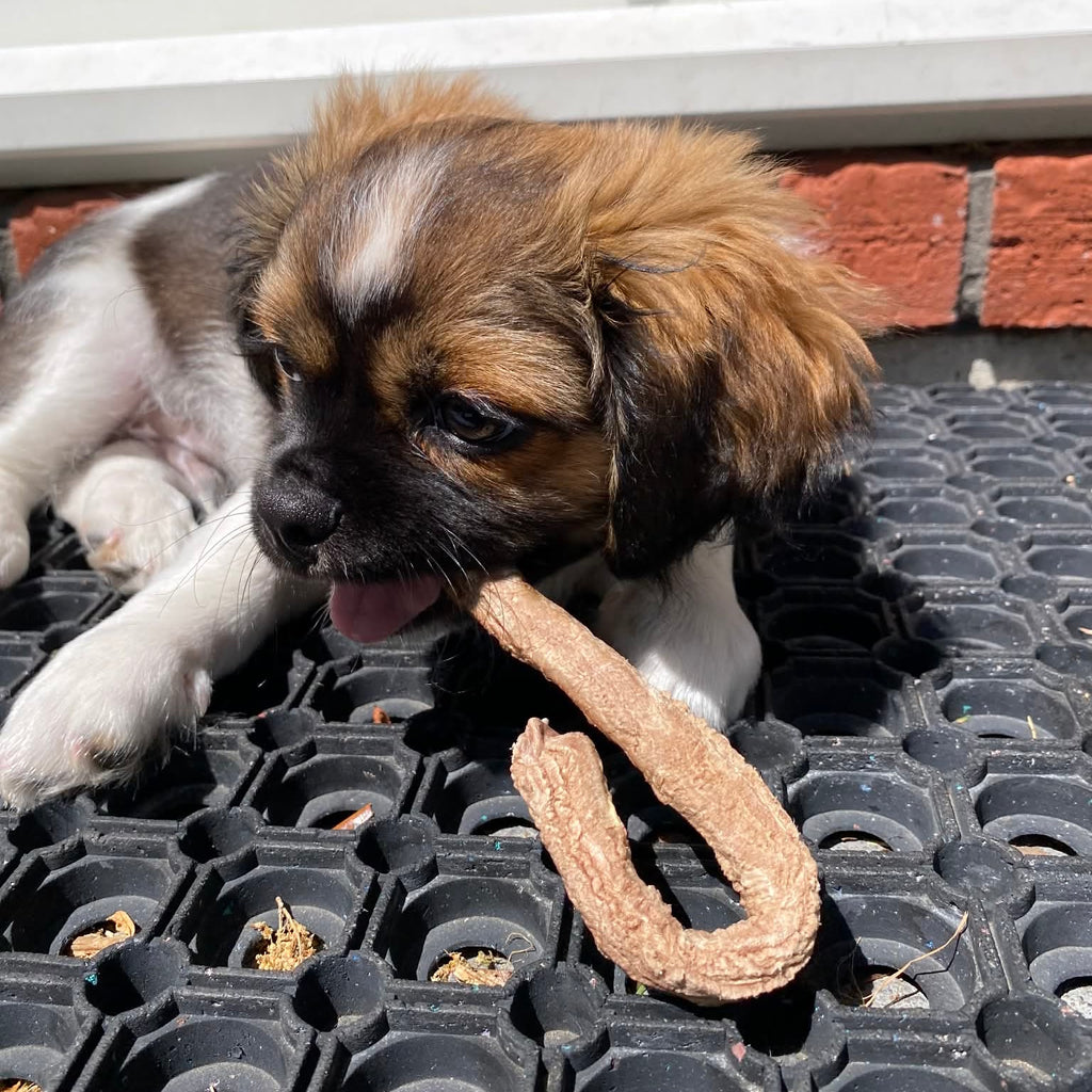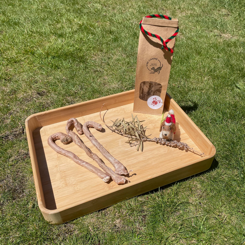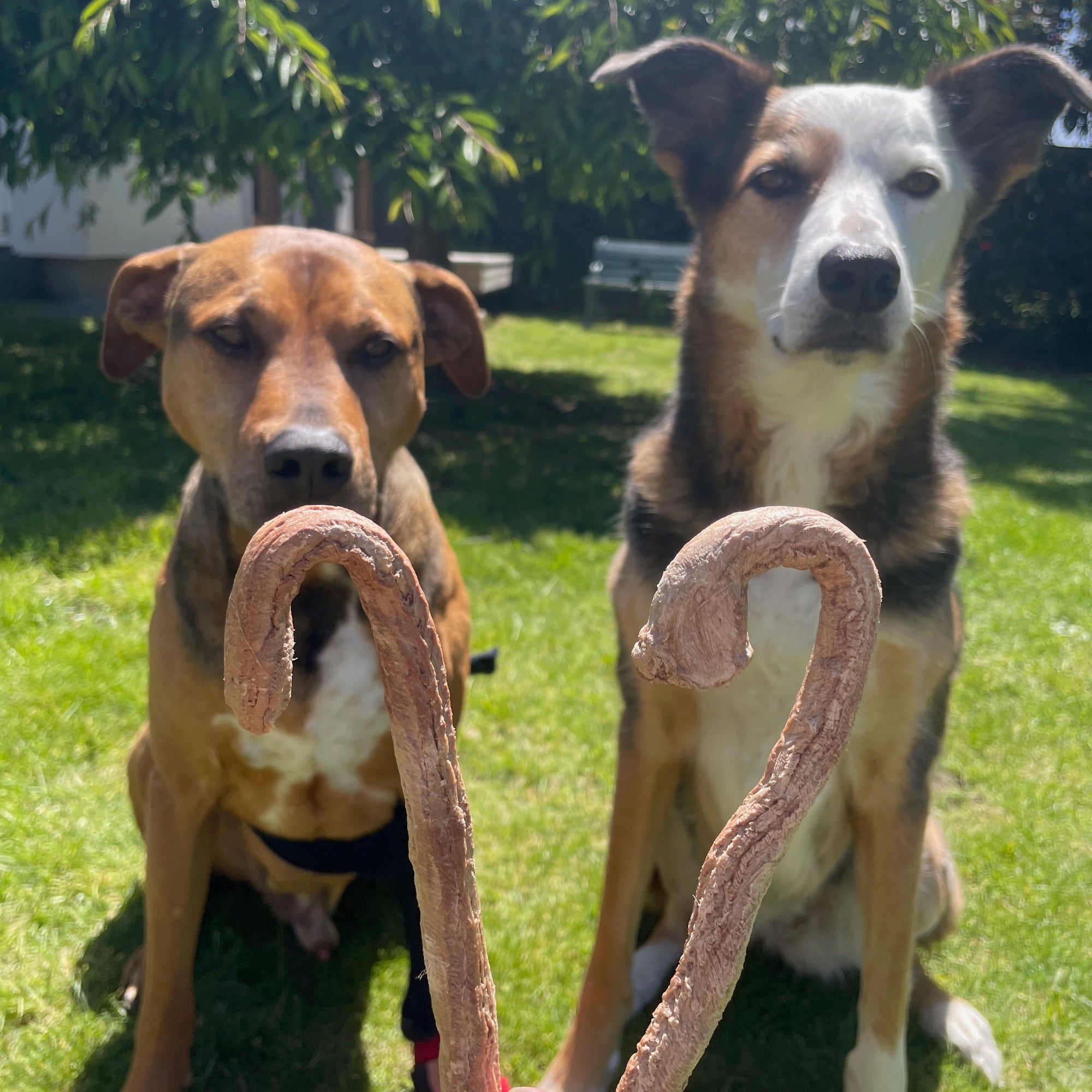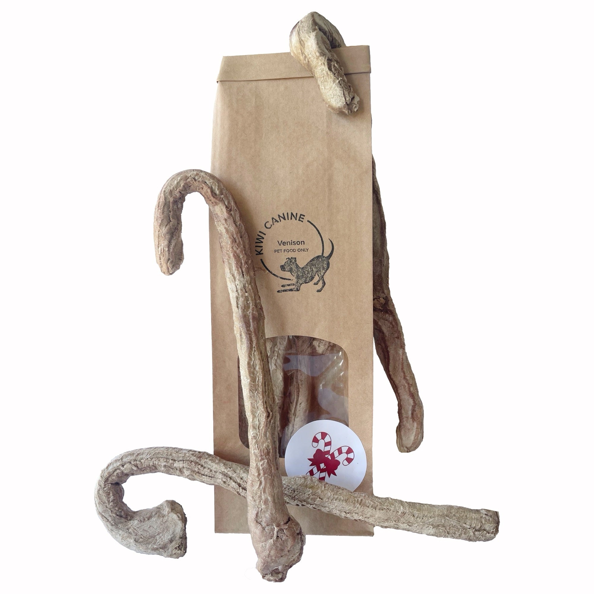 These chewy straps of pure meat in the shape of Candy Canes are bliss for any dog, including puppies and older dogs. They are a great natural dental chew and make for the perfect X-Mas present. These venison straps (esophagus) are freeze dried, clean to handle and you’ll never see any trace, once you’ve handed them over.