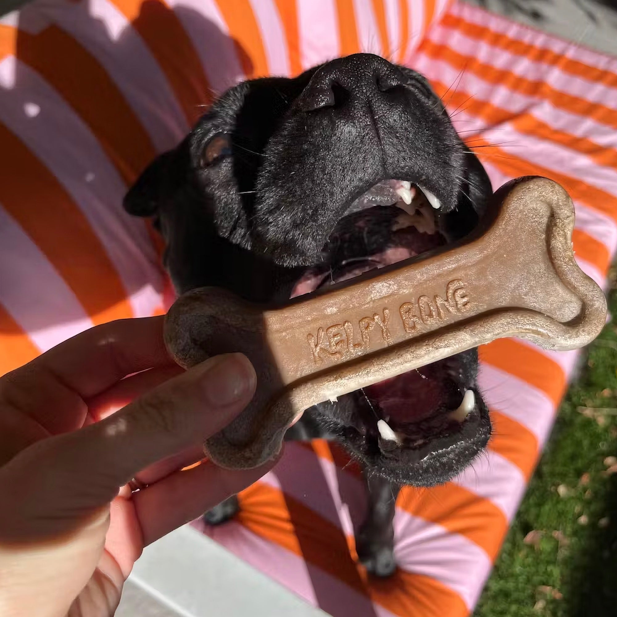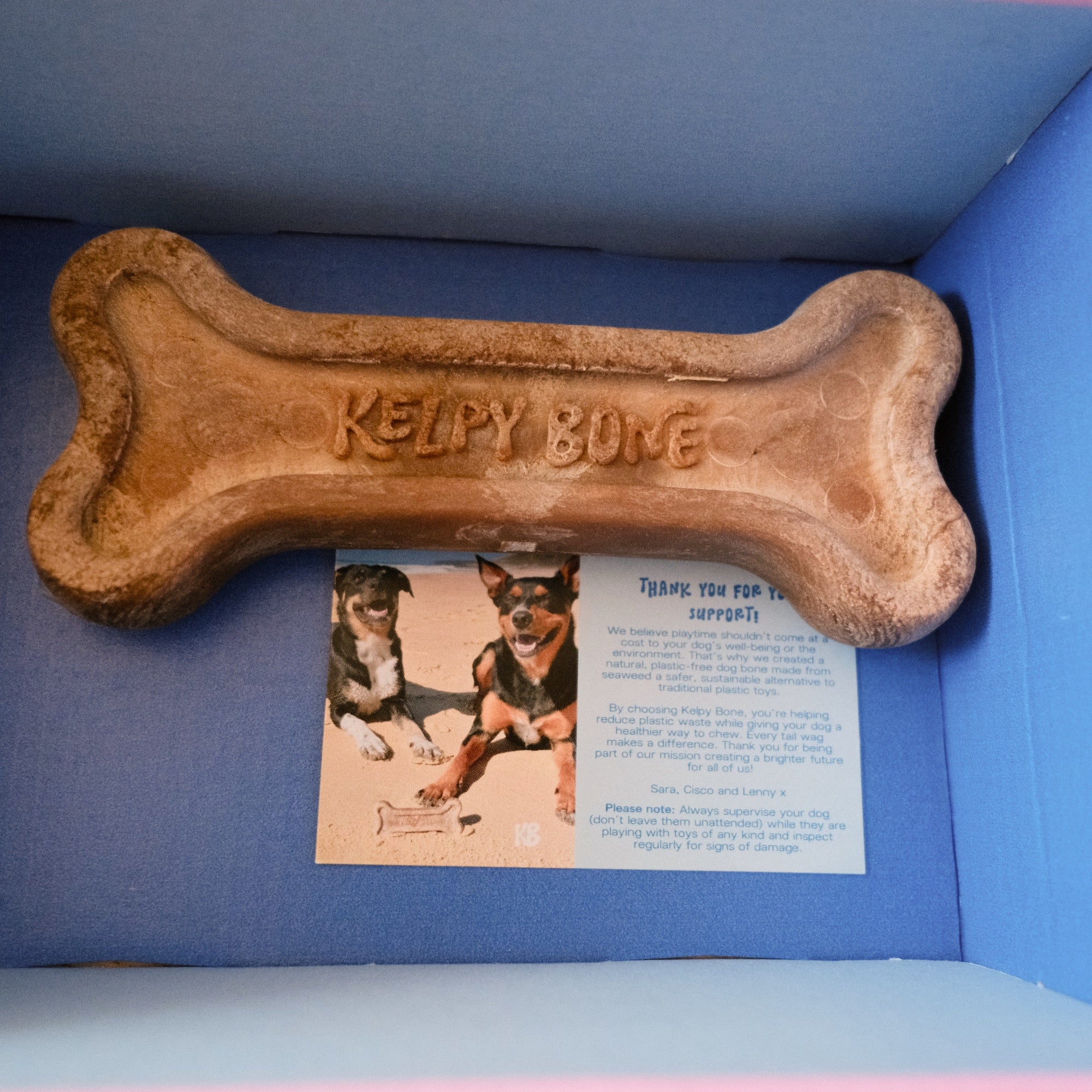 Kelpy Bones are made from seaweed, a renewable resource that grows quickly without fertilisers, fresh water, or farmland. Seaweed also helps the planet by capturing carbon at 20 times the rate of land-based forests.