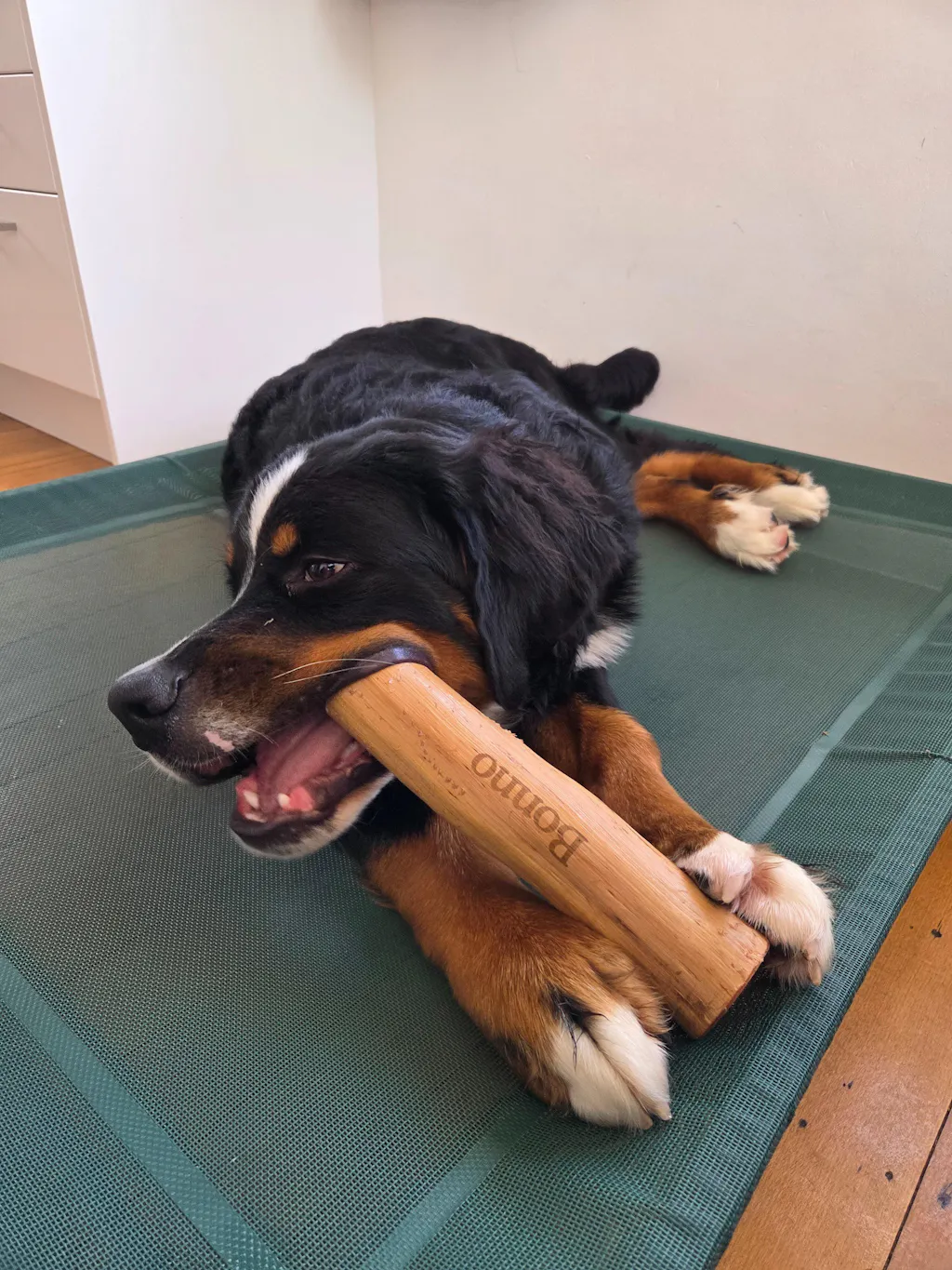 Safety Tips: Bonno is a dog chew toy. Replace Bonno when it is too short for your dog to hold in their paws. Discard large fragments. Suitable for puppies 3 months and older. Always supervise the use of Bonno.
