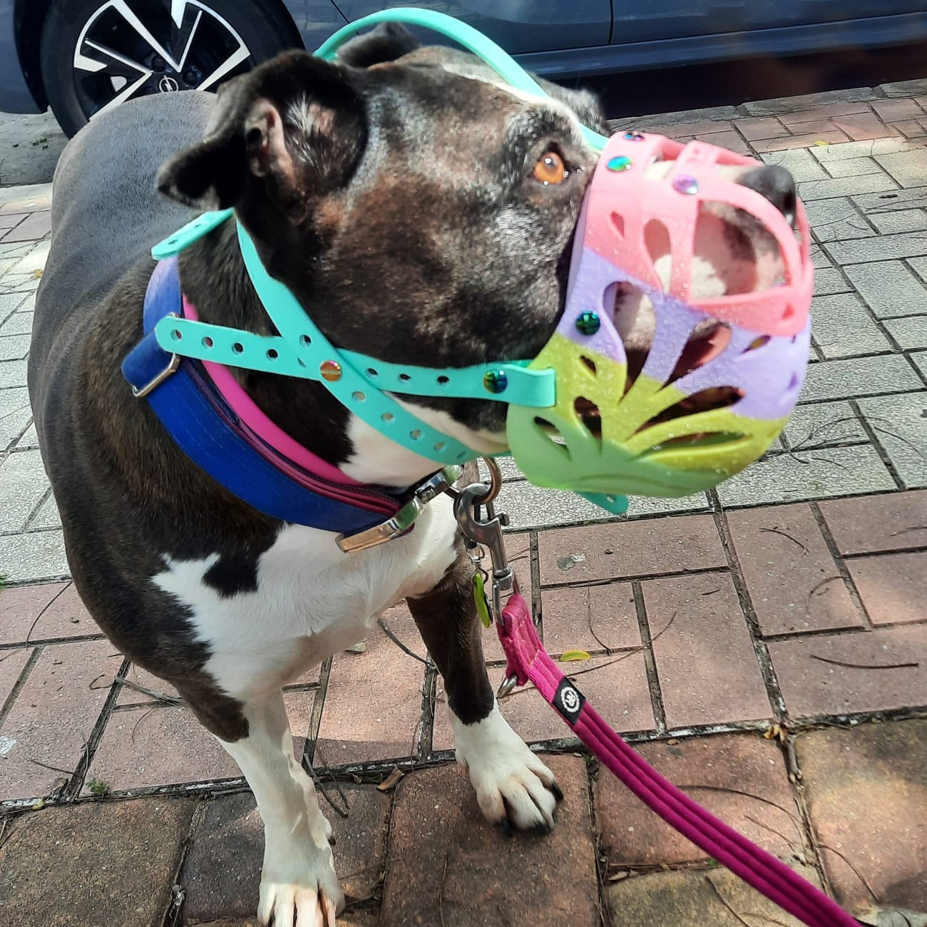This custom handmade muzzle can be made for any size, shape or breed of dog. The dog can easily pant and drink while wearing this muzzle. Whilst the muzzle comes pretty nicely adjusted already, it's great to know that you have the option to make final adjustments yourself.