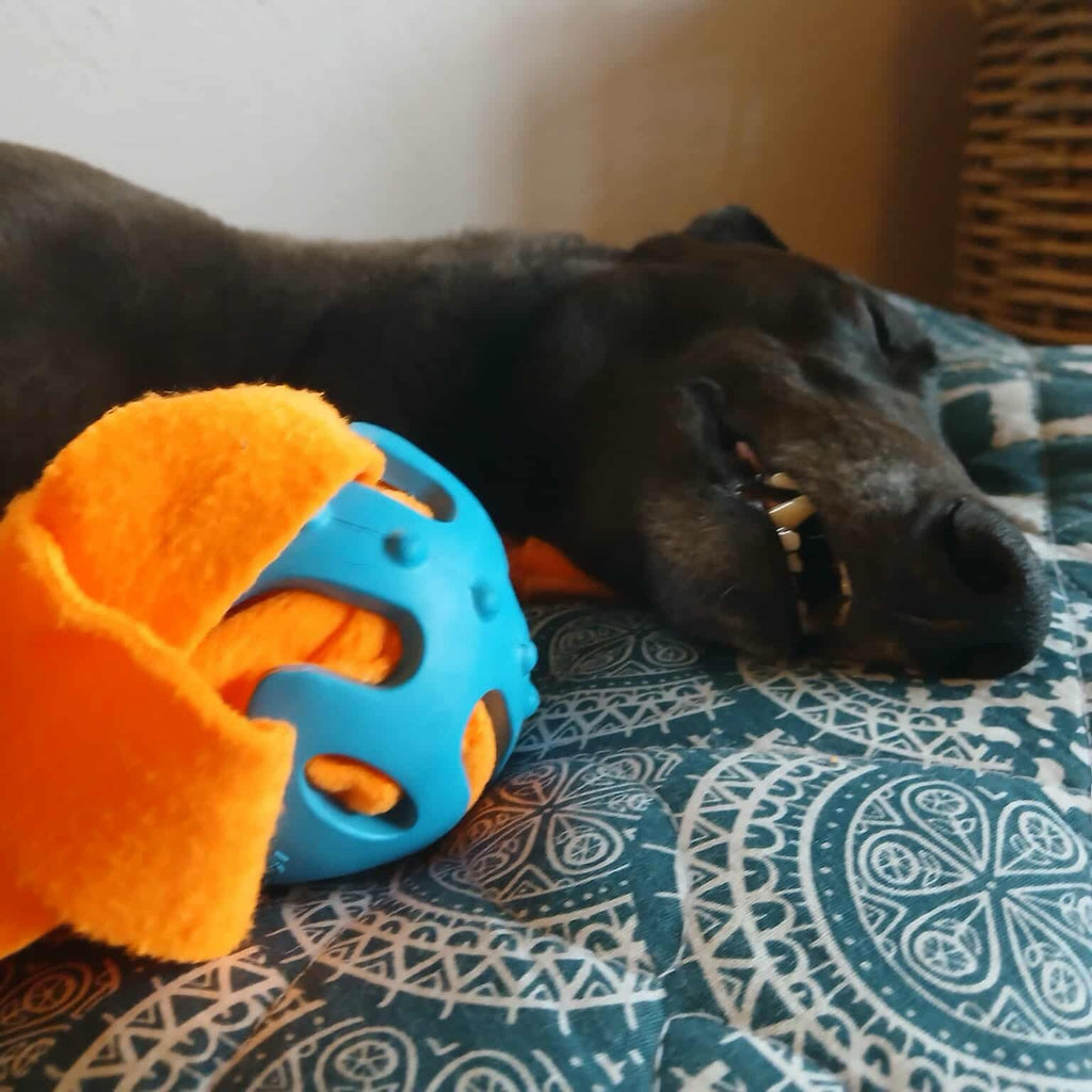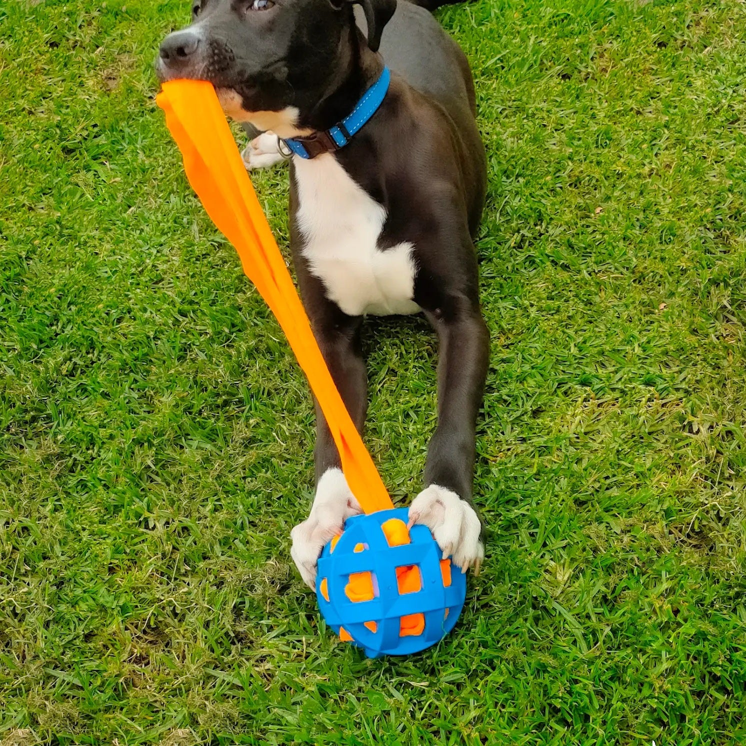 This unique, thick natural rubber ball with ingenious, patented design is non-toxic and comes filled with fleece strips. Your dog can de-stuff this toy again and again, and the stuffing 'magically' comes back (when you re-stuff it).